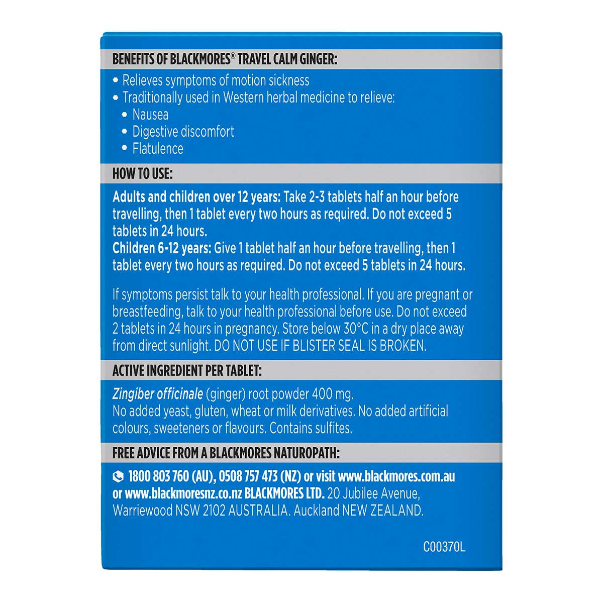 Blackmores Travel Calm Ginger is a travel aid that uses ginger root to settle tummies that are queasy from travel or movement. Take it prior to travelling to help with stomach upsets associated with motion. Travel Calm Ginger is specially formulated for anyone over six years old so it’s suitable for the whole family plus it’s a non-drowsy formulation, so you won’t miss a minute of your planned activities.