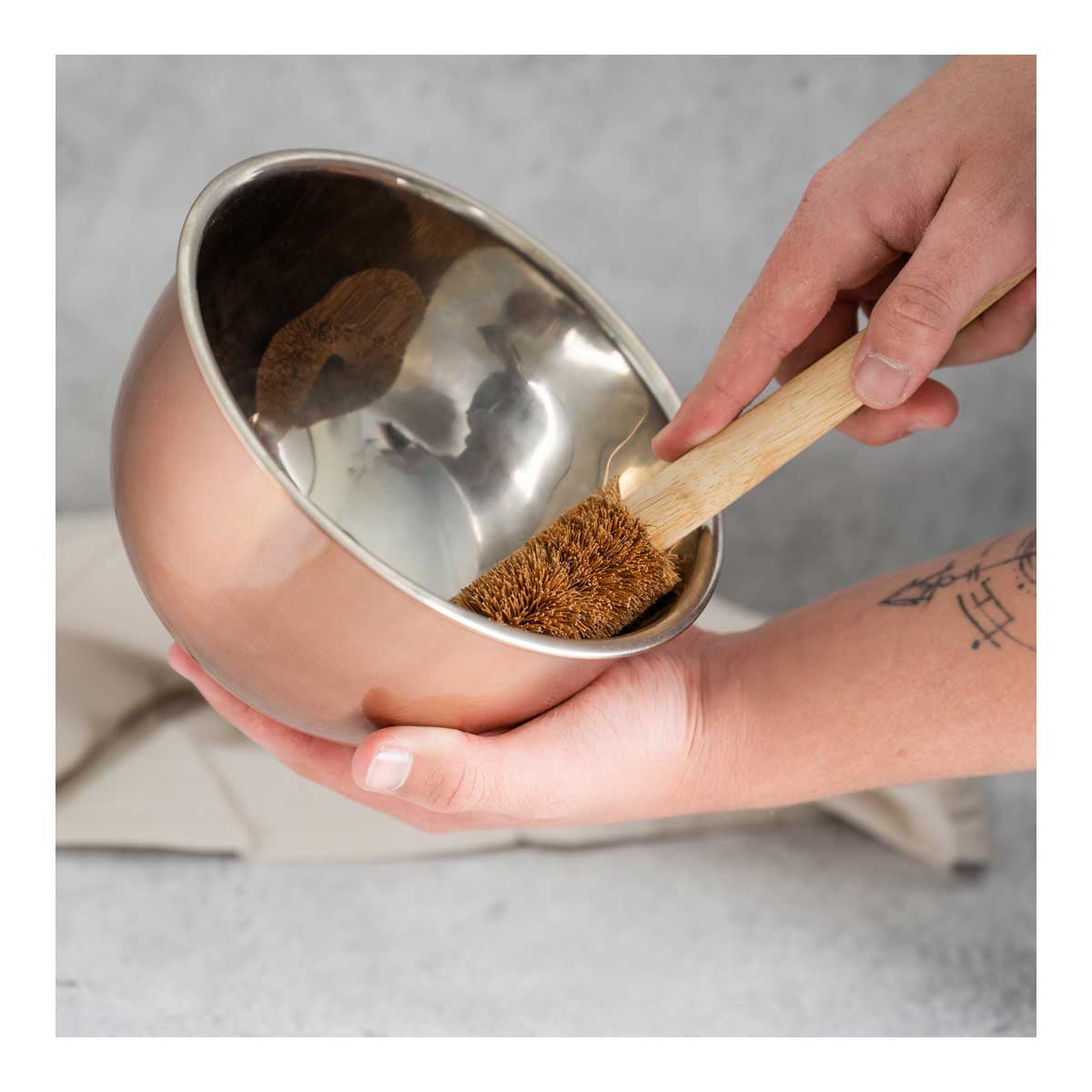CaliWoods Vege Brush is designed to clean root vegetables such as potato, kūmara and carrots with a natural coconut fibre brush head and rubber wood handle.