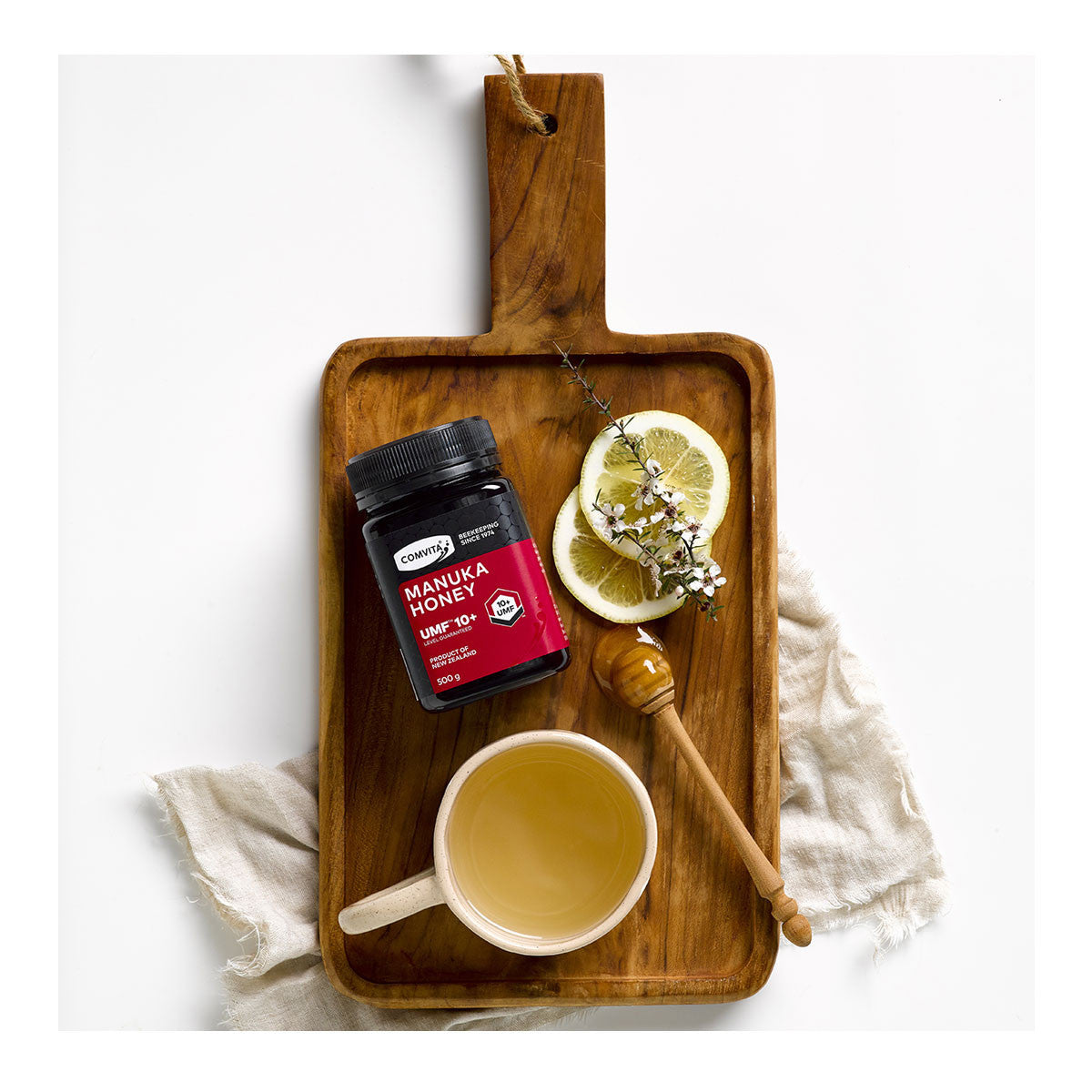 Comvita® UMF® 10+ Manuka Honey is produced in New Zealand and contains unique plant phenols naturally present at varying levels in honey made from the nectar of the Manuka bush (Leptospermum scoparium), native to New Zealand. New Zealand UMF® Grade Manuka Honey is highly regarded and its reputation continues to grow. You can enjoy the confidence of purchasing premium quality Manuka Honey backed by the UMF® guarantee.