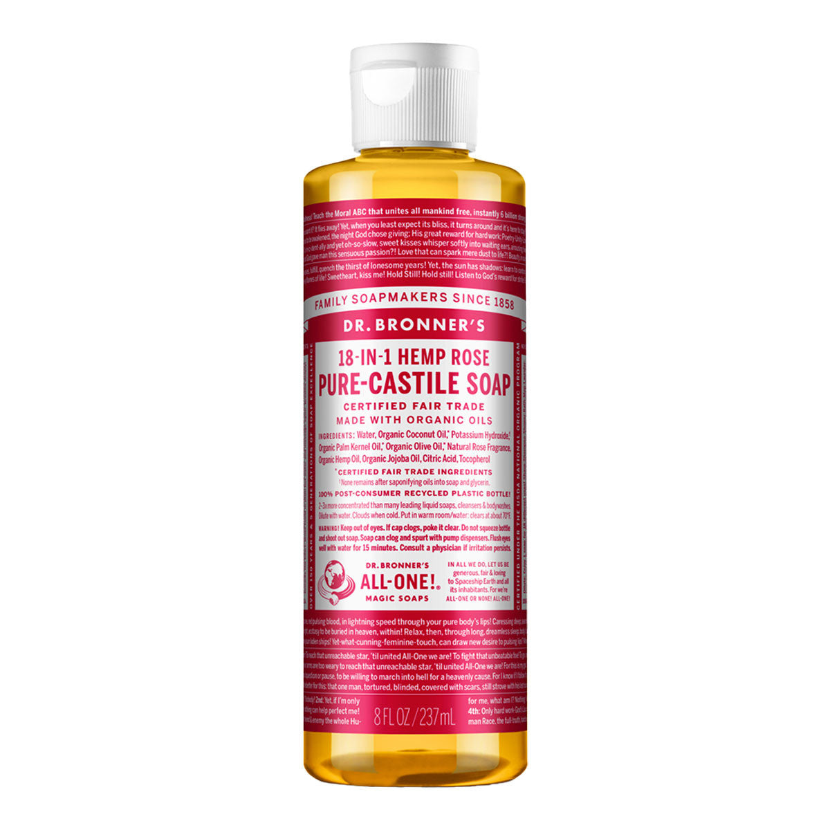 Dr Bronner's Rose Pure-Castile Liquid Soap is concentrated, biodegradable, versatile and effective. Made with organic and certified fair trade ingredients, packaged in a 100% post-consumer recycled bottle. All-One!