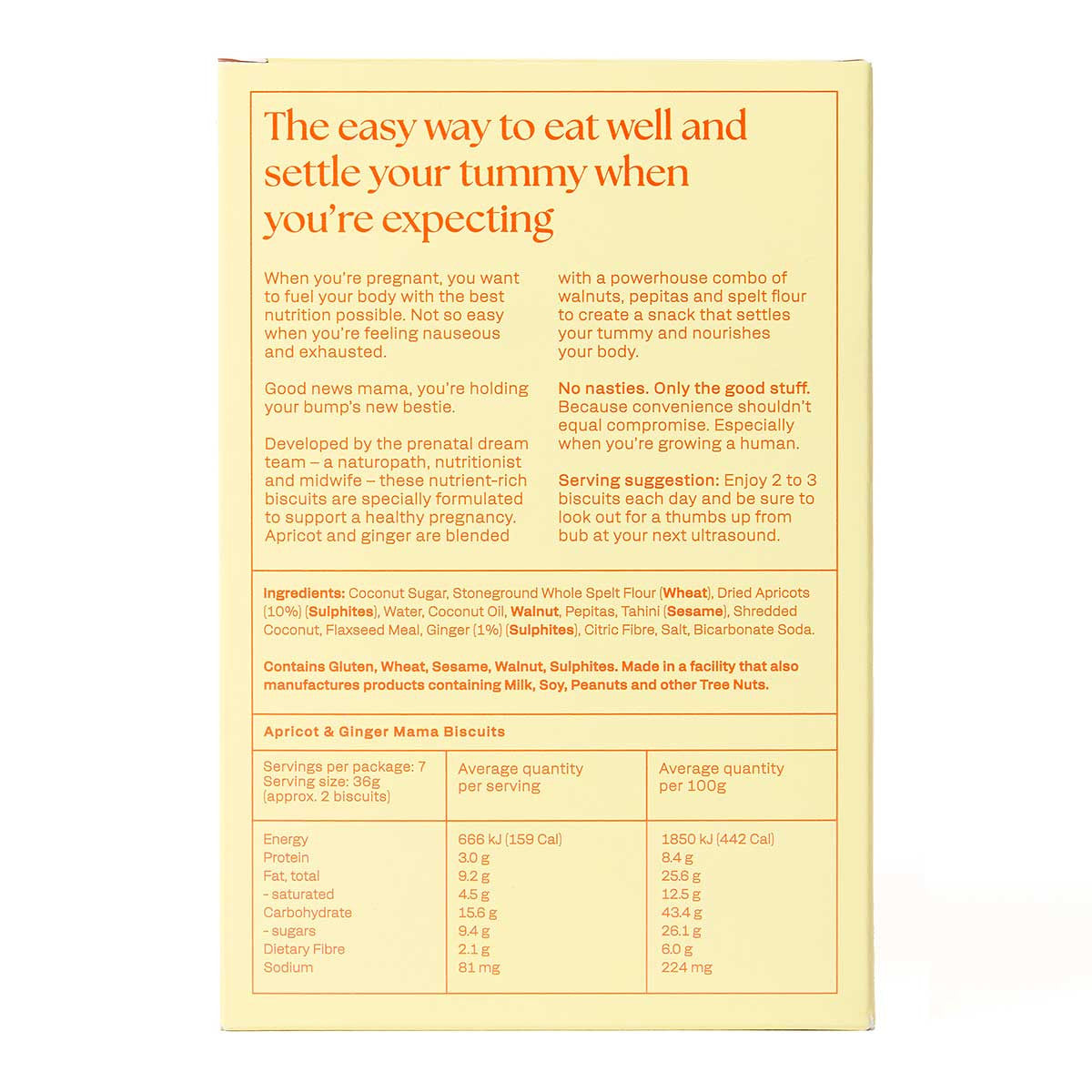 Franjos Kitchen Apricot & Ginger Mama Biscuits: Apricots and ginger are blended with a powerhouse combination of walnuts, pepitas, and spelt flour to create a delicious snack that settles your tummy while nourishing your body.