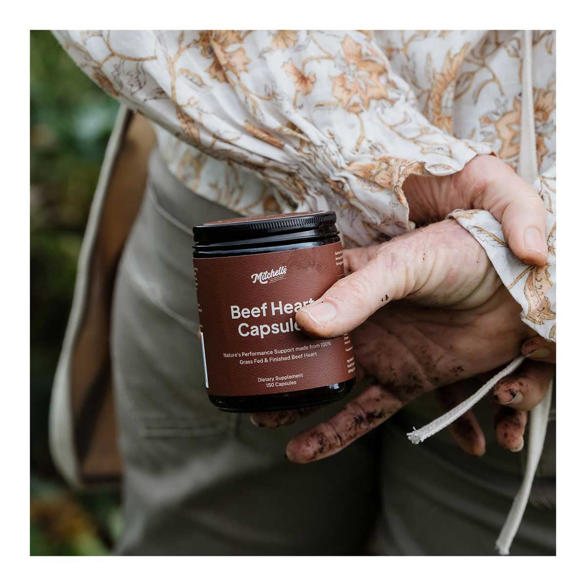 Rich in CoQ10, B12, and essential nutrients, Mitchells Beef Heart capsules support a strong heart, steady energy, and all-day vitality, from the inside out.