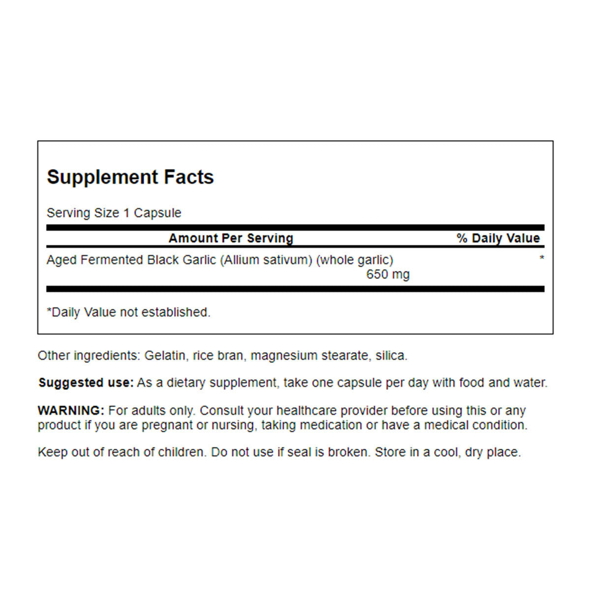 Each capsule contains:Aged Fermented Black Garlic (Allium sativum) (whole garlic) 650 mg    Other ingredients: Gelatin, rice bran, magnesium stearate, silica.