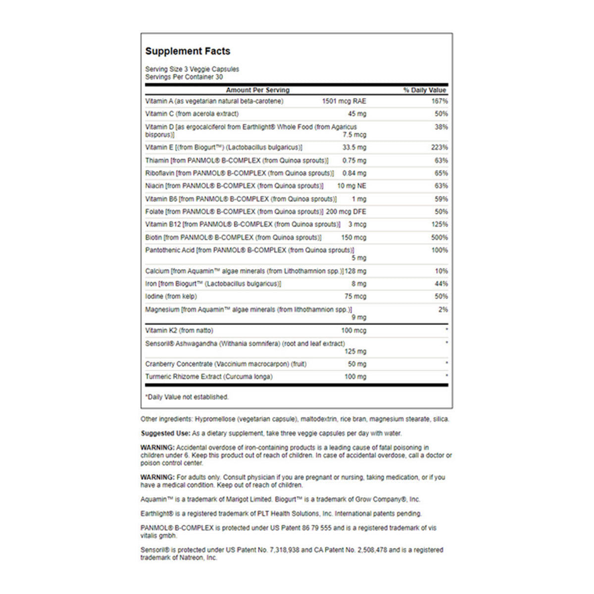Featuring vitamins and minerals from organic food sources, cranberry concentrate and turmeric root extract, every key ingredient in this potent multi comes entirely from real foods sources.