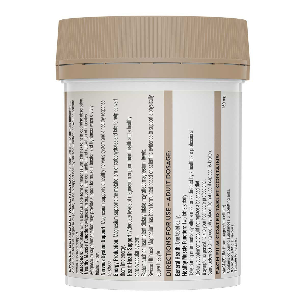 Healthy Muscle Function: Magnesium supports muscle relaxation by competitively binding to receptor sites normally reserved for calcium, which is the mineral that causes muscles to contract. Swisse Ultiboost Magnesium can be used to calm and soothe tight muscles.