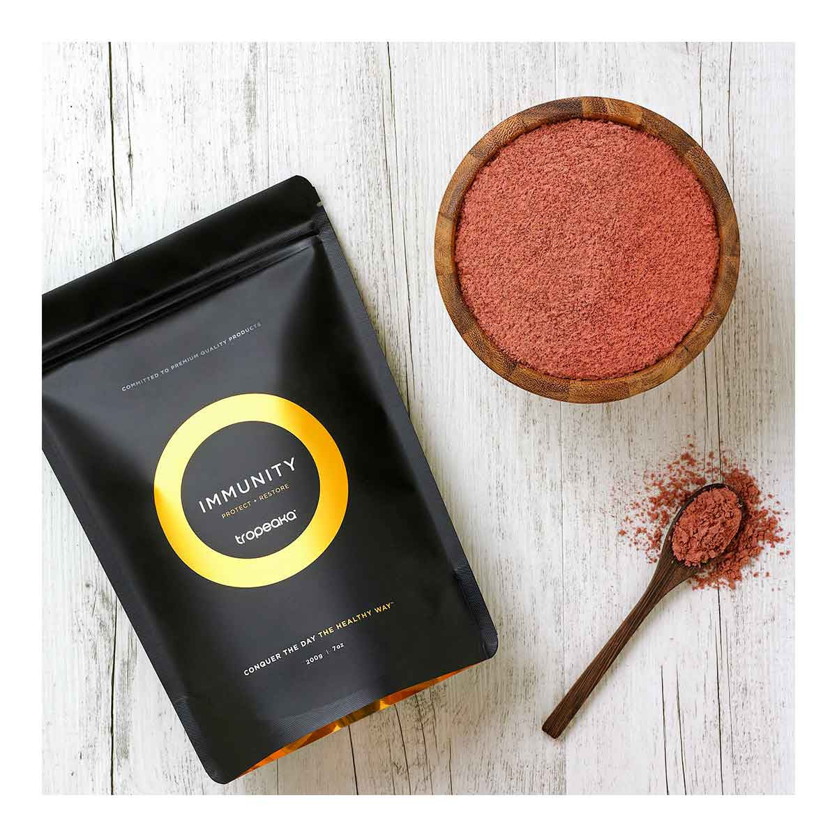 Tropeaka Immunity - Protect & Restore boasts 10 nutrient-dense, exotic superfoods that are packed full of antioxidants, vitamins and minerals. It's a vitamin C powerhouse containing powerful anthocyanins, plant sterols, phytochemicals and fibre.