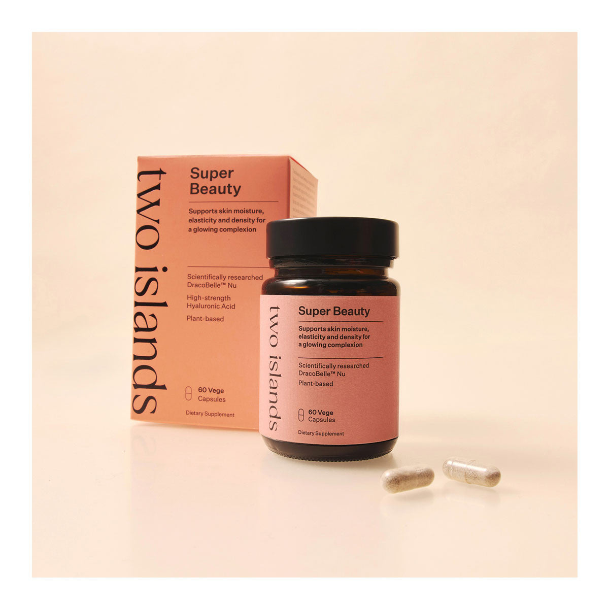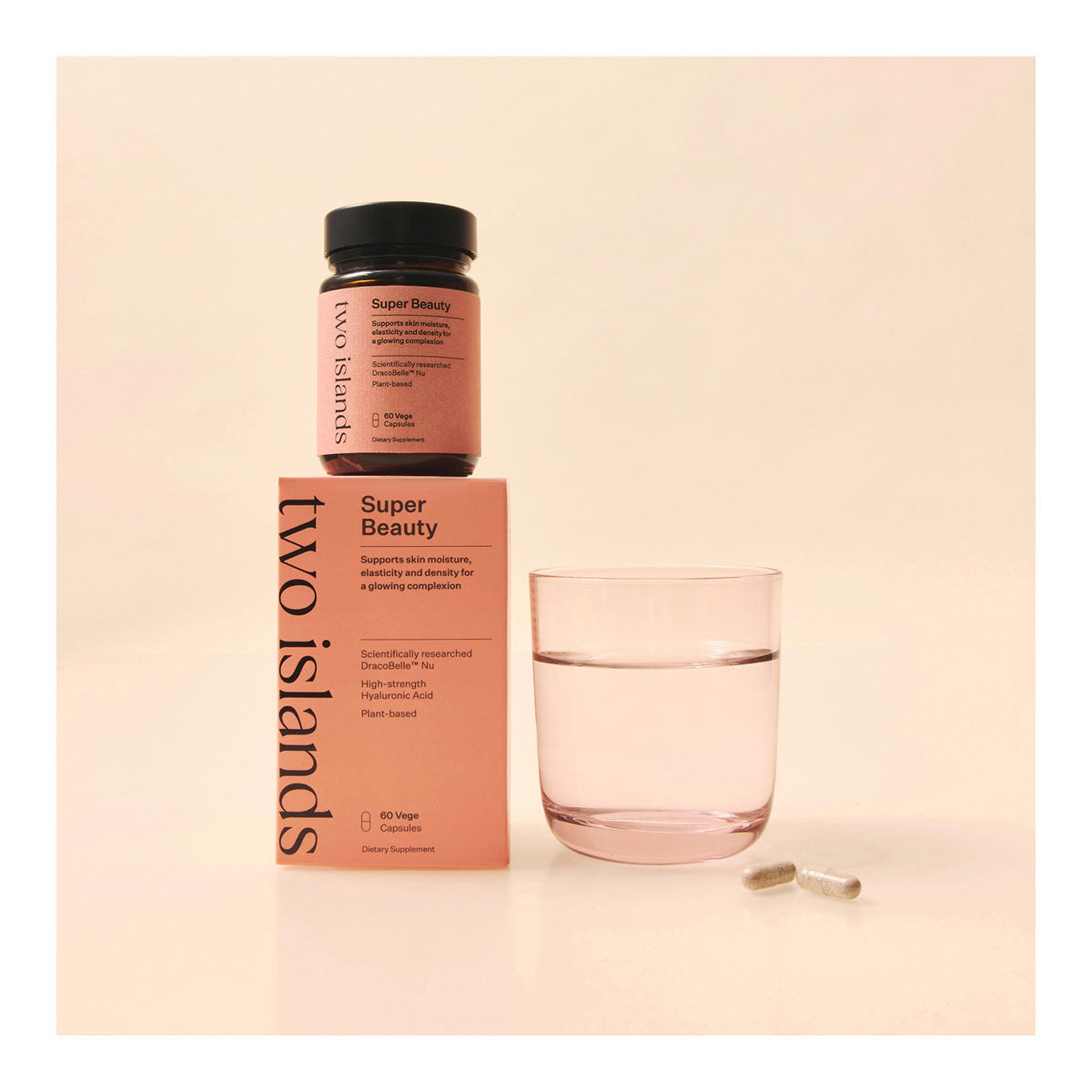 Two Islands Super Beauty, a complete daily beauty supplement that targets your hair skin and nails with optimal efficacy. Scientifically researched DracoBelle™ Nu has been shown to not only support skin moisture, elasticity and density to brighten your complexion for an enviable glow but also supports natural collagen production. This unique organically grown plant targets the pathways to support beauty and healthy ageing.