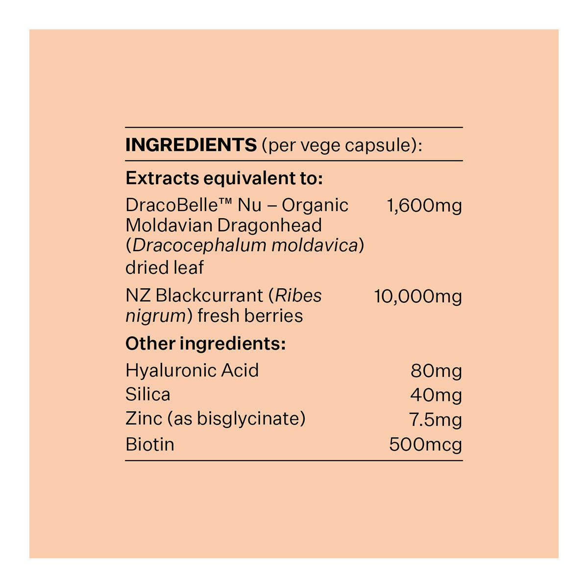 High strength Hyaluronic Acid, antioxidant rich New Zealand Blackcurrant and bioavailable Zinc further supports skin health and hydration. With Biotin and Silica to provide support for healthy hair and nail strength, this comprehensive plant-based formula is your ultimate beauty solution.